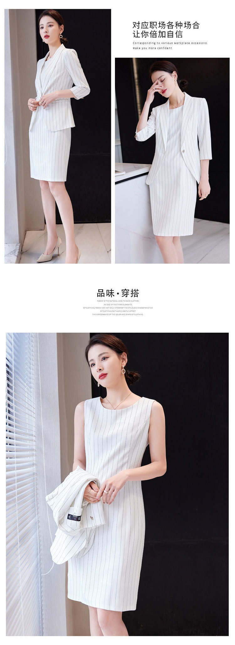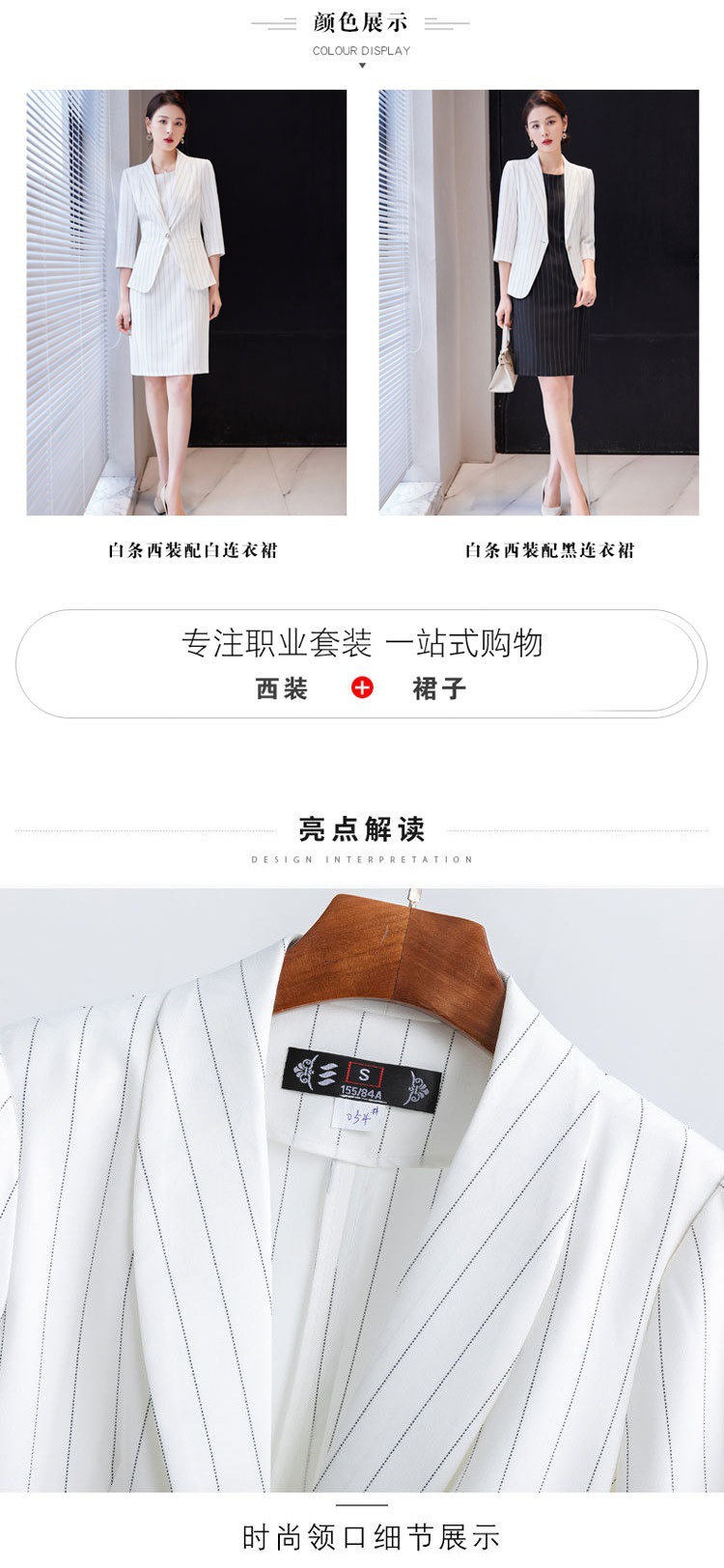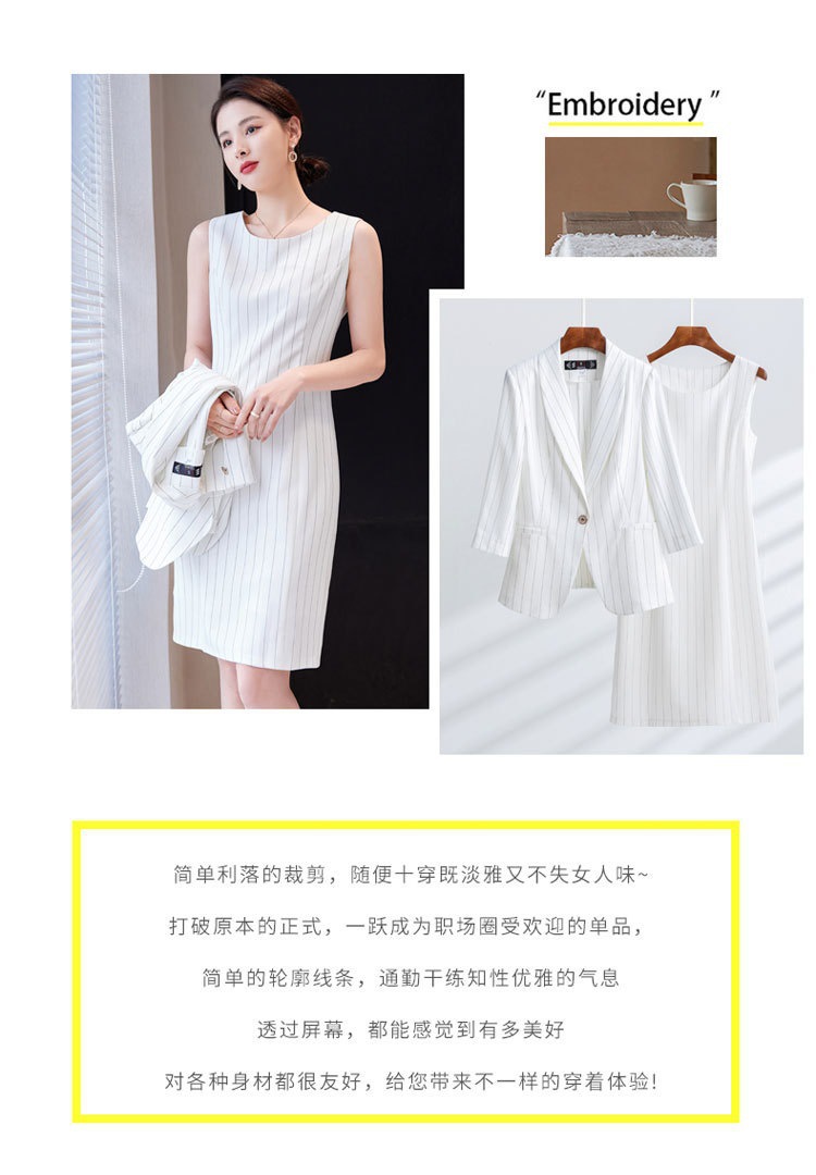 白色条纹西装连衣裙套装女职业装修身显瘦美容院主持人珠宝店套裙