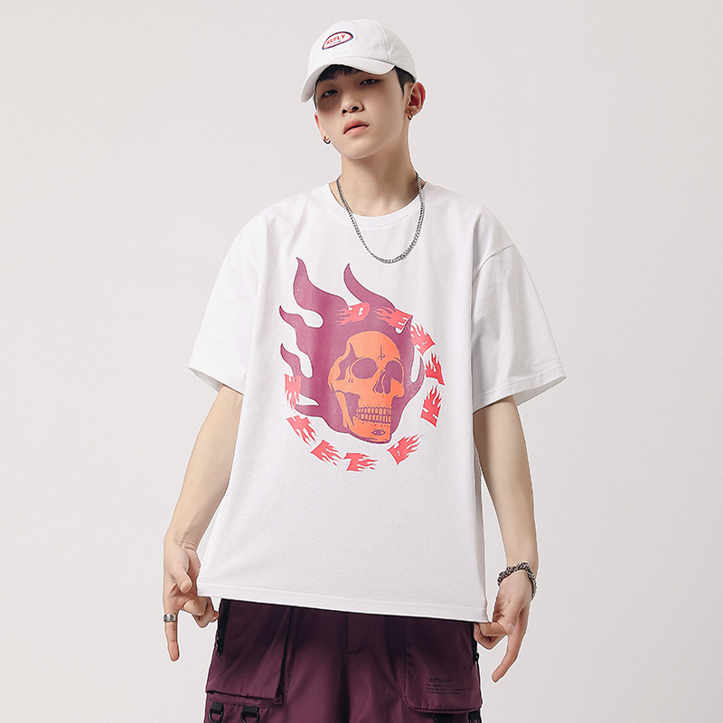 2021新款夏季印花短袖T恤男士港风宽松落肩袖半袖体恤圆领衫现货