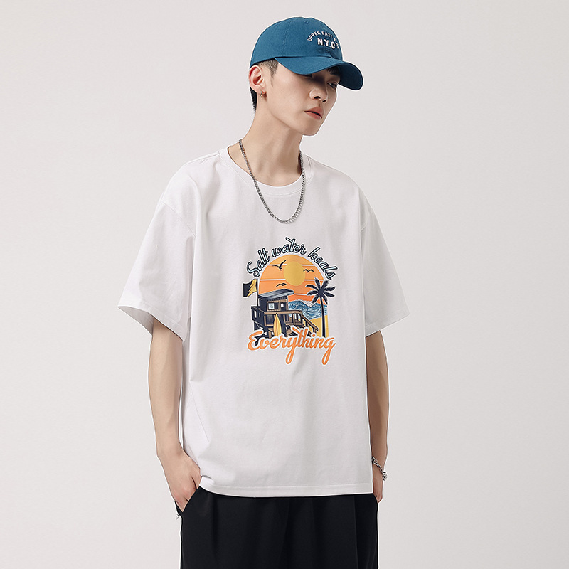 夏季新款印花短袖T恤青年男装180g纯棉落肩袖小清新半袖体恤衫潮