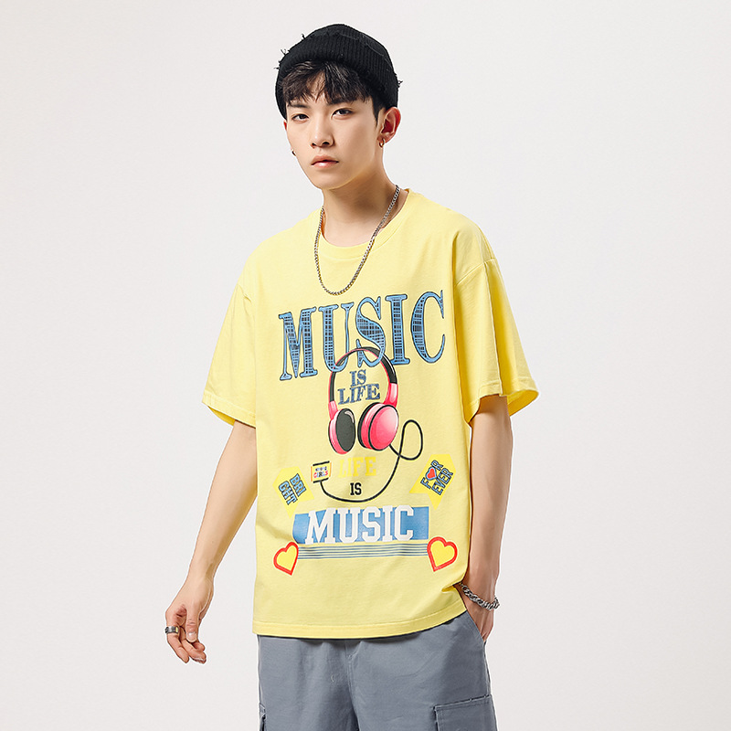 夏季日系纯棉T恤男装音乐耳机印花短袖体恤衫潮牌青少年上衣批发