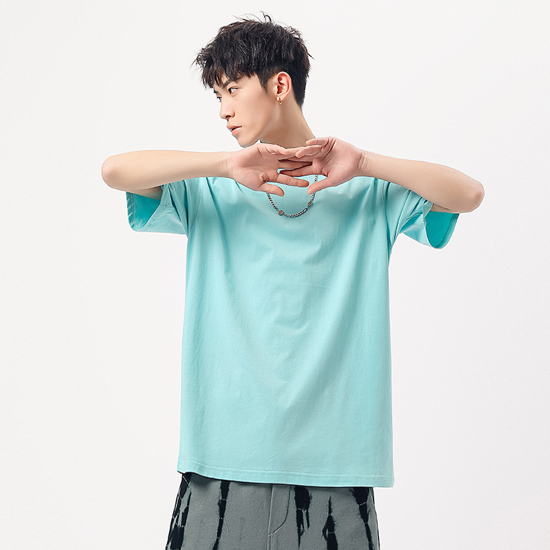 蒂芙尼蓝短袖T恤男夏季纯色日系简约纯棉落肩半袖体恤电商TB代发