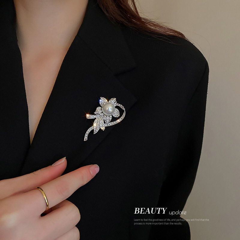 韩国珍珠锆石百合花胸针女高级百搭时尚简约衣饰优雅大气西装配饰