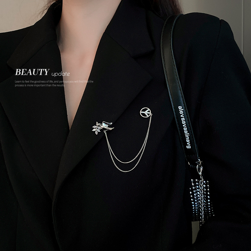 韩国锆石树叶小鸟链条胸针ins冷淡风新款别针个性高级感西装配饰