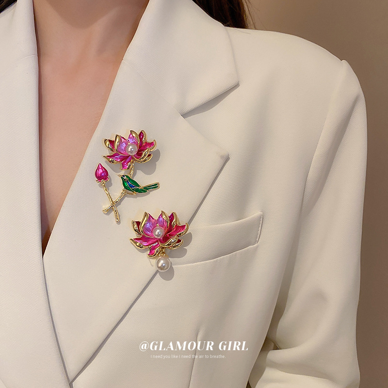 国潮风荷花珍珠胸针时尚气质文艺范配饰个性设计感甜美夸张衣饰女