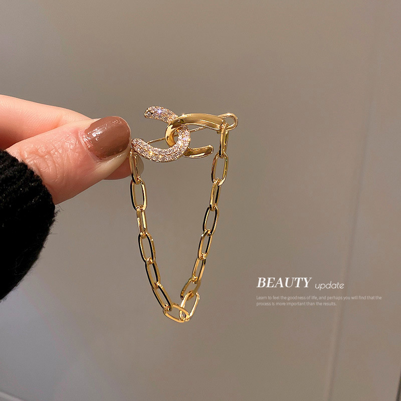 镶钻双C形链条胸针韩国东大门金属设计感别针时尚气质西装配饰女
