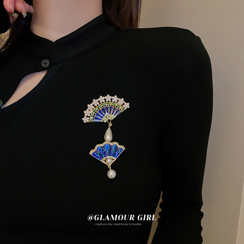 国潮风几何镶钻珍珠扇子水滴吊坠胸针时尚气质设计感配饰个性衣饰