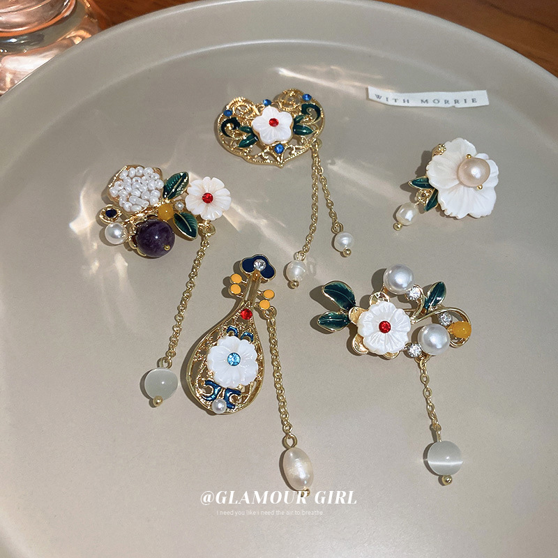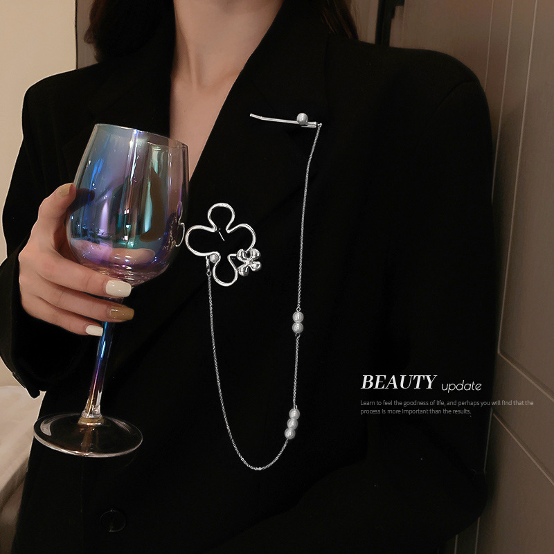 韩国冷淡风花朵珍珠流苏胸针发夹一体配饰网红简约多戴设计胸针女