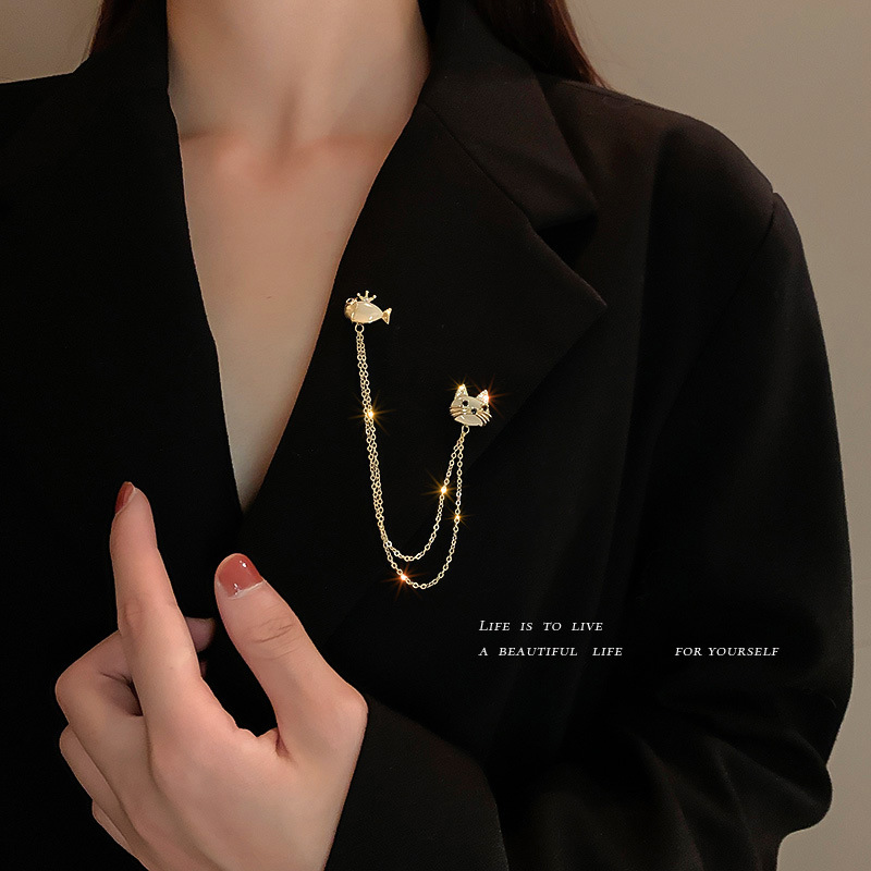 真金电镀猫眼石锆石猫咪小鱼胸针韩国时尚百搭配饰气质温柔服饰女