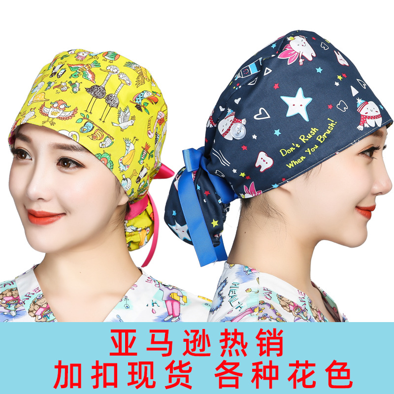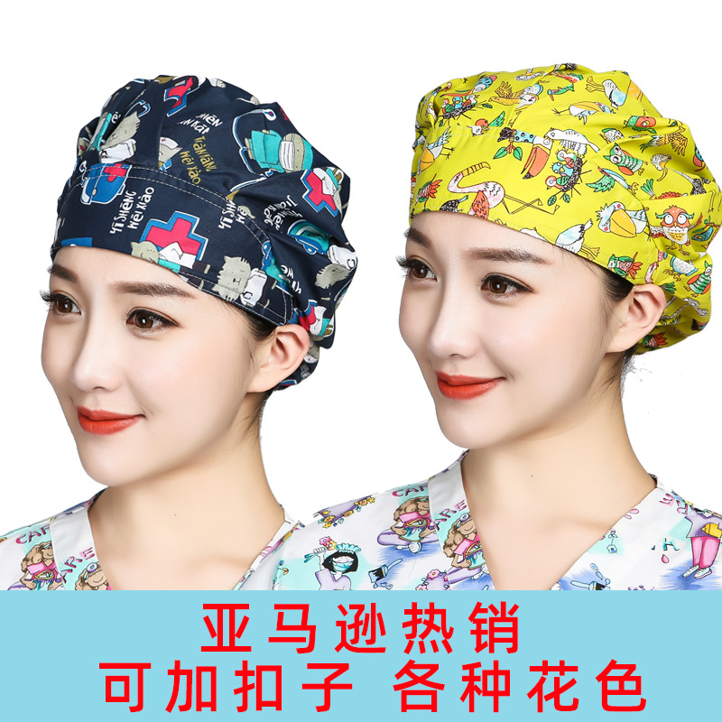 护士医院防尘工作帽亚马逊卡通印花帽纽扣马尾长发绑带新款包头帽