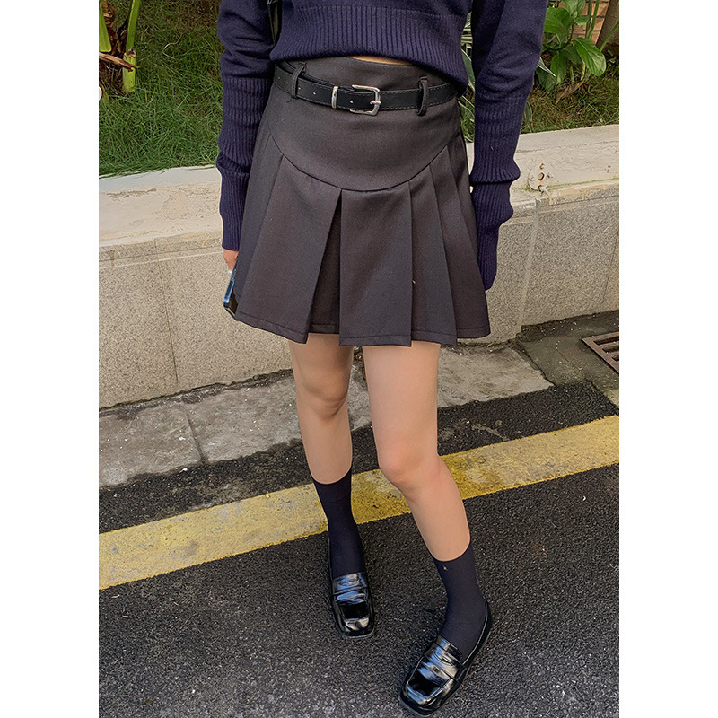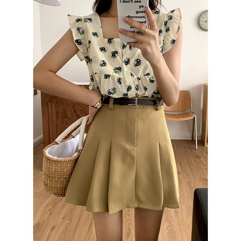 七姨 复古气质配腰扣2022夏季高腰显瘦百搭A字带内衬百褶短裙女