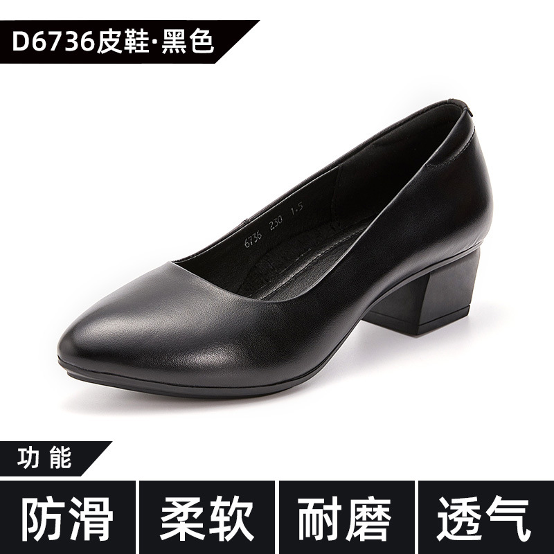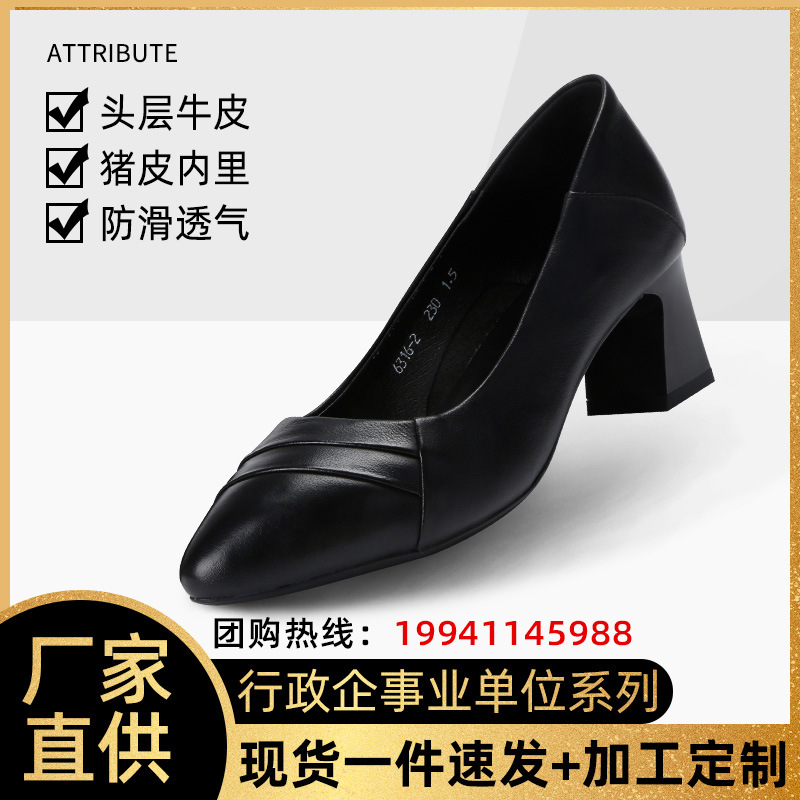 春季真皮无声工作鞋女黑色粗跟通勤皮鞋工装酒店银行上班单鞋女鞋
