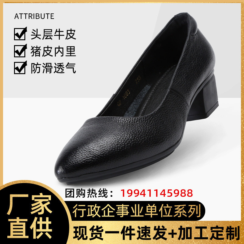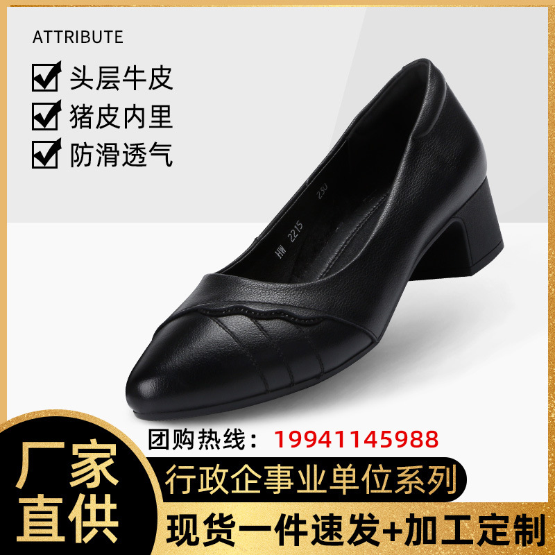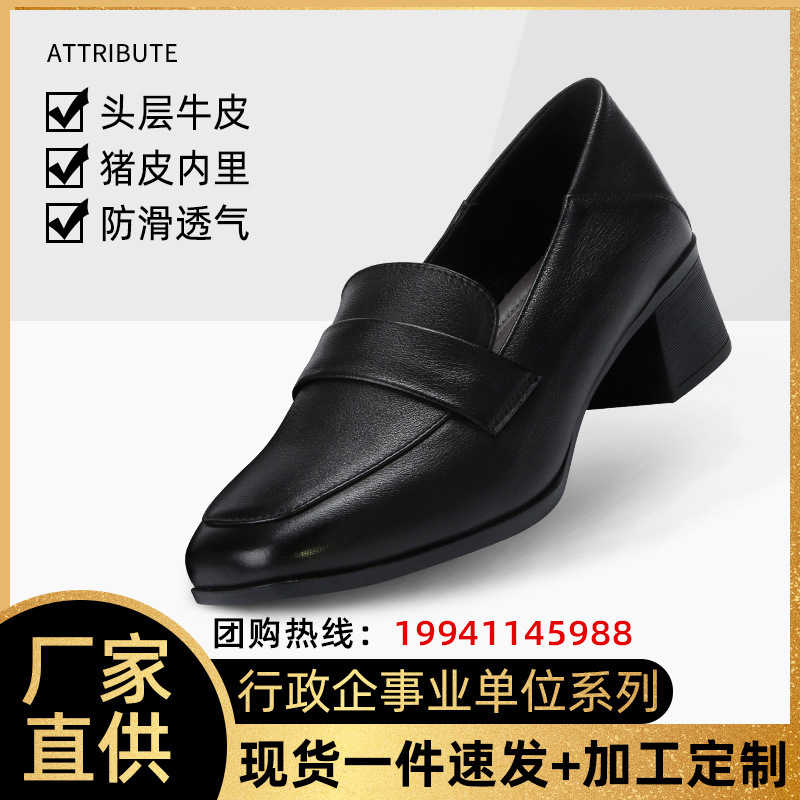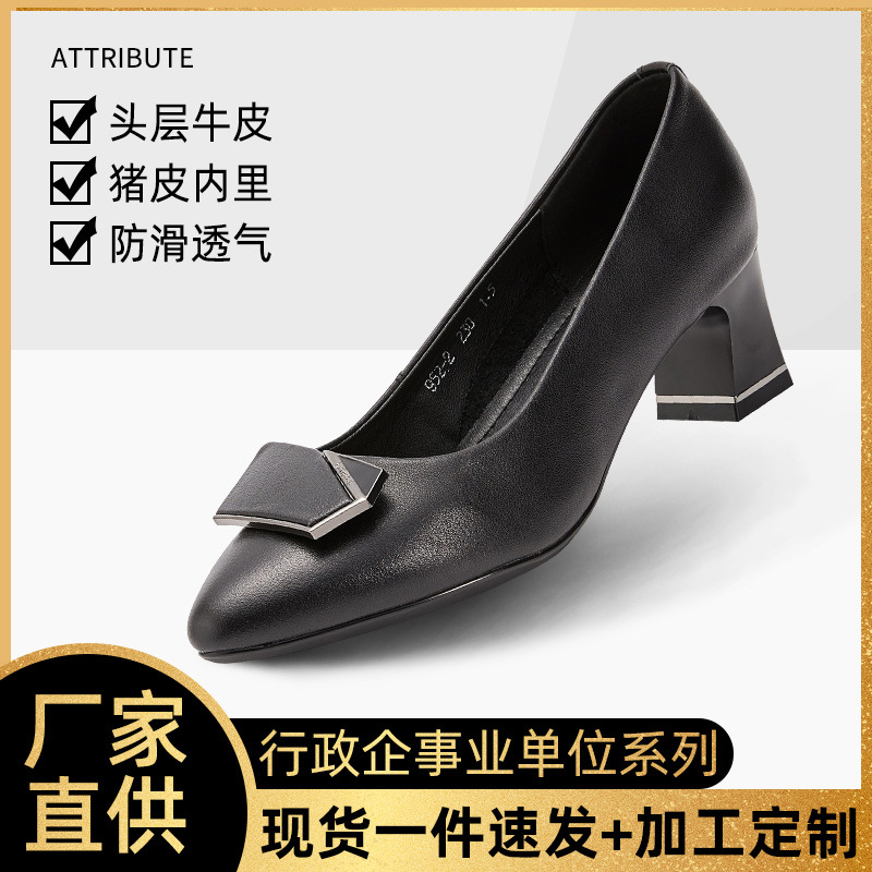 女士行政单位皮鞋2022新款软底粗跟正装皮鞋黑色真皮办公室西装鞋