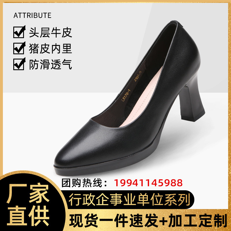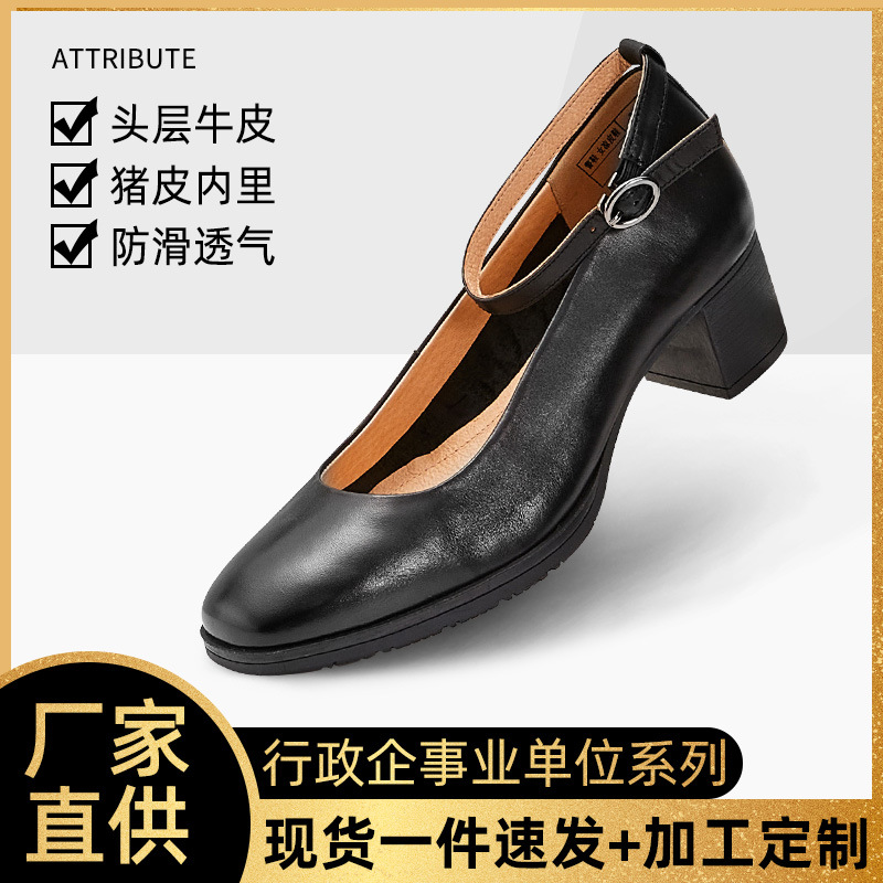 2022新款女士黑色行政皮鞋圆头粗跟正装高跟皮鞋真皮办公室西装鞋