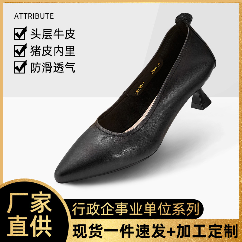 女士尖头行政皮鞋2022新款粗跟正装高跟皮鞋黑色真皮办公室西装鞋